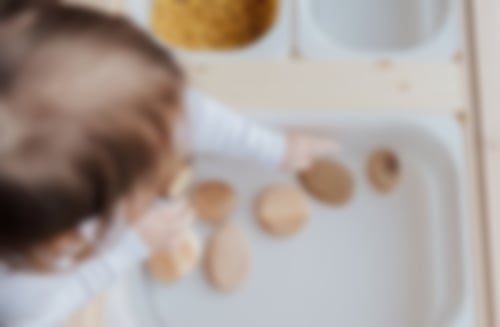 Zur Unterstützung der taktilen Wahrnehmung bieten wir u.a. Fühlwannen mit verschiedenen Materialien an (z. B. Bohnen, Kastanien, Reis, Blätter). Diese werden kombiniert mit verschiedenen Alltagsgegenständen (z. B. Becher, Löffel, Grillzangen, Trichter). Die Fühlwannen laden so zum Wühlen, Umfüllen, Verstecken und Suchen, Sortieren oder kreativem Spiel ein.